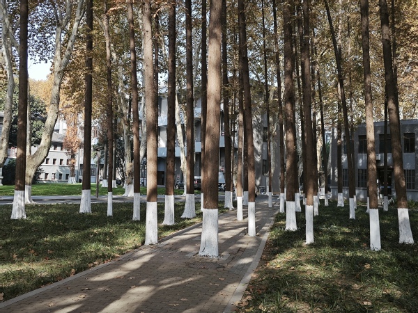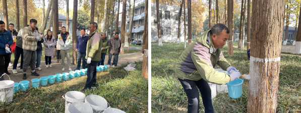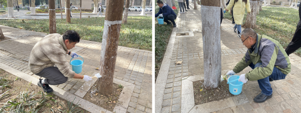 涂白活动开始前,中心主任助理、园林绿化高级技师魏声兵向参加活动的全体人员科普了树木涂白的相关知识。他指出,树木涂白是树木养护管理的一项重要内容,不仅可以减少冬季树木水分的蒸发,还可以增强树木的抗冻、抗病、抗虫的机理功能,具有防护、杀菌、杀虫的多重作用。在涂白作业过程中,为了提高涂白的质量和美观效果,养护人员一般会采用“拉线涂白法”或“立杆涂白法”,保证涂白上口齐平、高度一致、涂刷均匀,从而确保树木涂白的效果与环境的美化。讲解结束后,两个支部的党员和入党积极分子或两人一组,或三人一队,领取刷子和石灰浆桶等工具,按照止口平整、均匀统一的涂白要求,把石灰浆均匀地涂抹在树干上,既给大树们穿上了御寒防虫的“新衣”,又确保了校园环境的美观,成为冬日校园一抹亮丽的风景线。