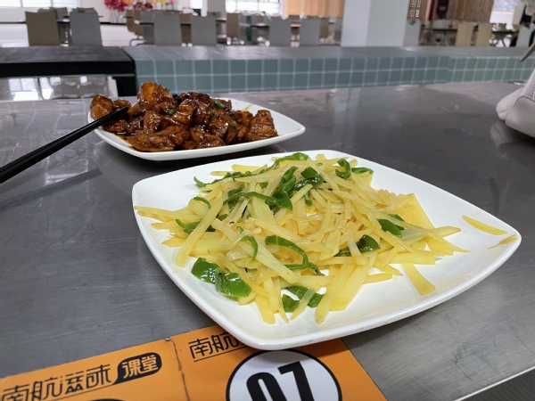 在厨艺课堂老师的悉心指导下,学员们认真学习洗菜、切菜、翻炒、烧制、装盘等菜肴出品流程。在制作红烧肉的过程中,学员们学习了如何选择优质猪肉,如何将猪肉切成均匀的小块,如何制作烹饪等技巧;在制作青椒土豆丝的过程中,学员们学习了如何选择新鲜的青椒和土豆,如何切成细丝,如何烹饪土豆丝,以保持其脆嫩的口感。