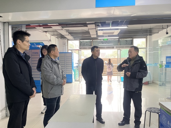 12月14日上午,南京市邮政管理局局长徐向阳一行莅临我校将军路校区快递超市调研指导,后勤集团副总经理李辉陪同调研。