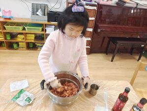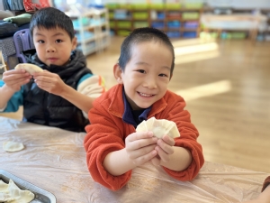 品尝美味:美食的香味飘满了整个幼儿园,小朋友们吃在嘴里,暖在心里,还把自己的劳动成果进行分享,幸福欢快的气氛洋溢在幼儿园的每个角落。