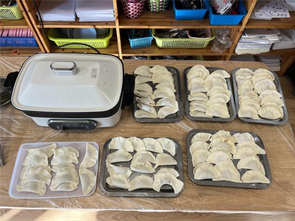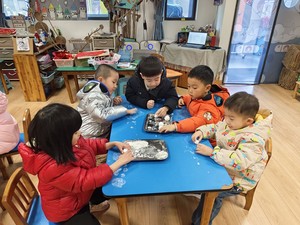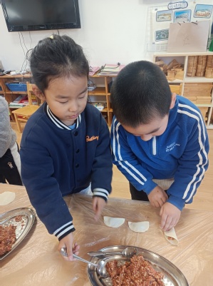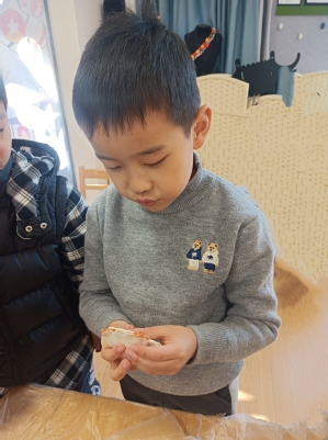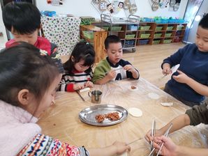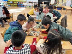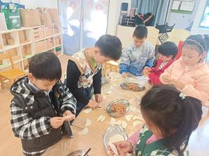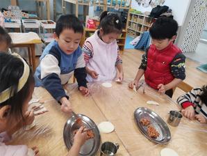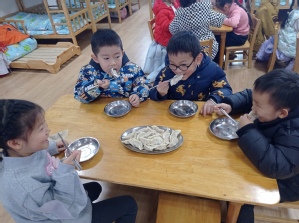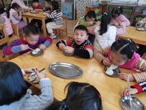 包饺子:冬至包饺子,是传统习俗,大班孩子们今天也来包饺子了。他们一个个热情高涨,学着老师,像小大人似的卷起衣袖,积极参与,认真观察,动手完成整个包饺子的过程,欢声笑语不断。不一会,一排排独具个性的饺子很快就摆满了一个个盘子……看着自己包的饺子,每个孩子的脸上都洋溢着兴奋与自豪。