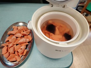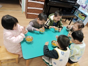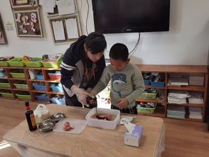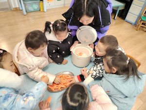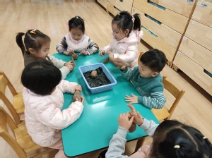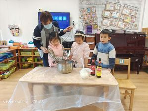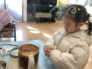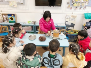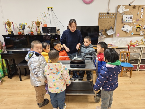 煮番薯汤:番薯汤也是冬至的美食之一,因“番”和“翻”同音,冬至吃番薯,就是将过去一年的霉运全部“翻”过去,阖家团圆。小班孩子和老师一起制作甜甜的番薯汤,在洗一洗、切一切、煮一煮的过程中体验了动手的快乐和成功的喜悦。