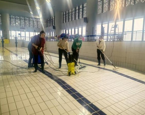 开荒工作工程浩大、时间紧迫、任务艰巨,对整个开荒团队而言是一个巨大的挑战。前期,开荒领导小组及时协调开荒进度,保证“有仗可打”;合理进行人员分工,确保“有兵可用”;筹备发放保洁物资,确保“弹药充足”。开荒过程中,保洁员们发扬“吃苦耐劳、 甘于奉献、 敢打硬仗”的后勤精神,以“干、实干、拼命干、撸起袖子加油干”为口号,拿着高压水枪和各类清洁工具,咬紧牙关坚守岗位,对游泳馆内每一个角落进行全方位清洗,不留死角。经过半月的辛勤劳动,游泳馆内的环境焕然一新。