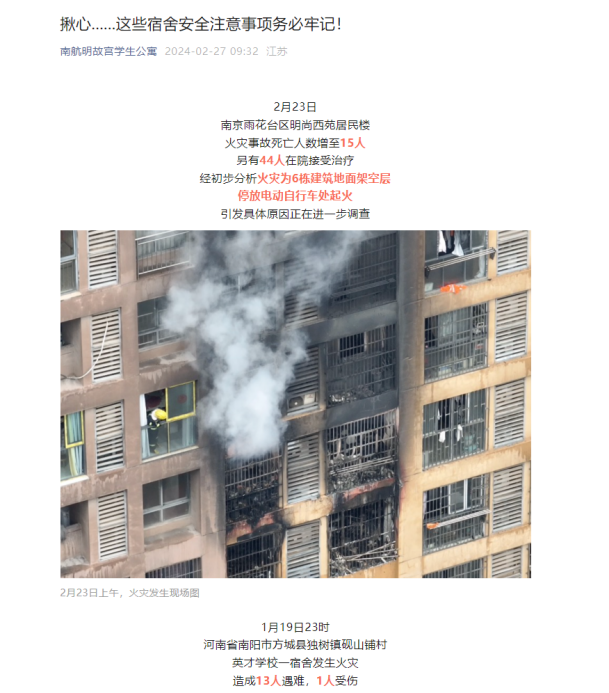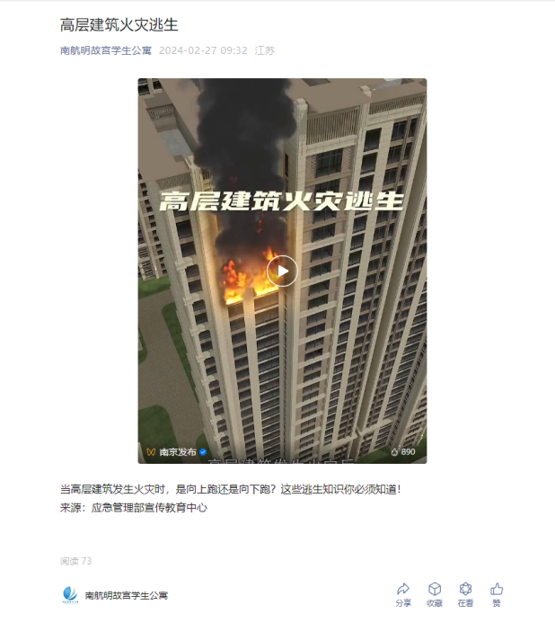 2月27日起,公寓服务中心通过微信公众号发布多篇消防安全类推文,进行安全防火及高层逃生注意事项宣传。通过查房等契机,对在住学生进行安全用电、消防常识等宣传,不断增强广大学生的消防安全意识。