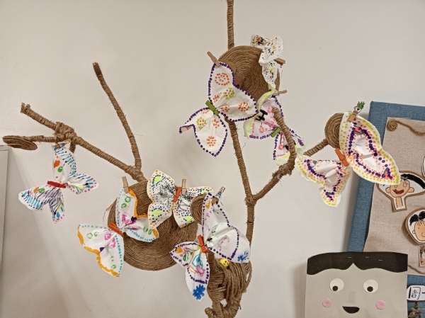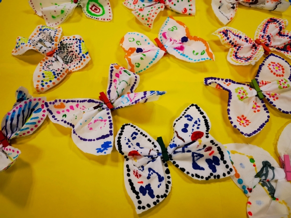 在这草木勃发的节气,孩子们通过画、折、夹的方式描绘心中美妙的画卷,诠释别样的春暖花开;他们用纸巾做的小蝴蝶栩栩如生,仿佛真的张开翅膀,快乐的在草地上飞舞。