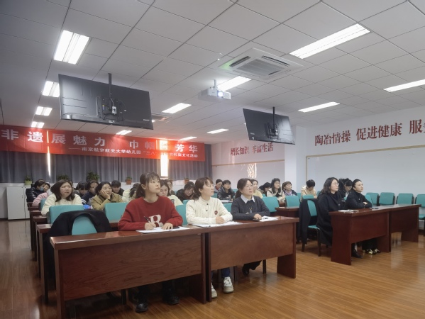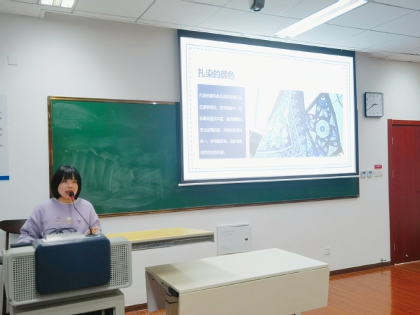 美术教研组组长王宁萍向大家讲解了"扎染"的文化内涵,介绍了扎染的起源、特色及工艺技法,还为大家展示了部分扎染作品,让大家近距离感受扎染的艺术魅力,感悟中华民族传统文化的韵味。