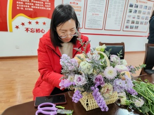 3月7日上午,活动现场变身“花的海洋”,各种鲜花、绿植摆放其中,散发着迷人的芳香。插花活动中,史老师从如何挑选花卉、搭配颜色、修剪花枝、精心插放等多方面讲解插花技巧和各种花卉所蕴含的花语和祝福。大家一边侧耳倾听,一边拿起花枝动手修剪,全身心地投入到插花活动中,在插花中寻找乐趣,从作品中获得满足,在交流中拉近距离,美丽的花束更传递了美好和祝福。