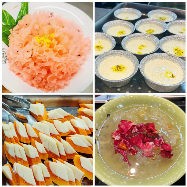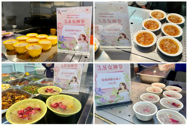 三校区食堂结合节日特点和大众口味精心研发,最终在节日当天推出一系列美味又美观的女神节特色甜点,有清爽甜脆的富贵牡丹、有美容养颜的玫瑰银耳汤、有甜而不腻的蜂蜜桂花炖奶、有酥脆香甜的樱花酥等等,每一份甜点都蕴藏着南航食堂对我校女同胞的甜蜜祝愿。