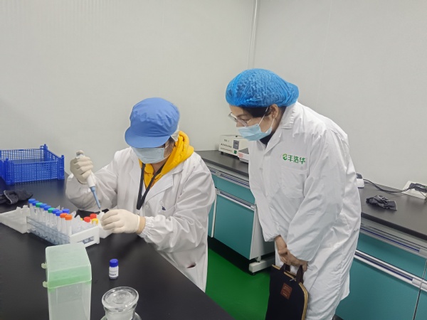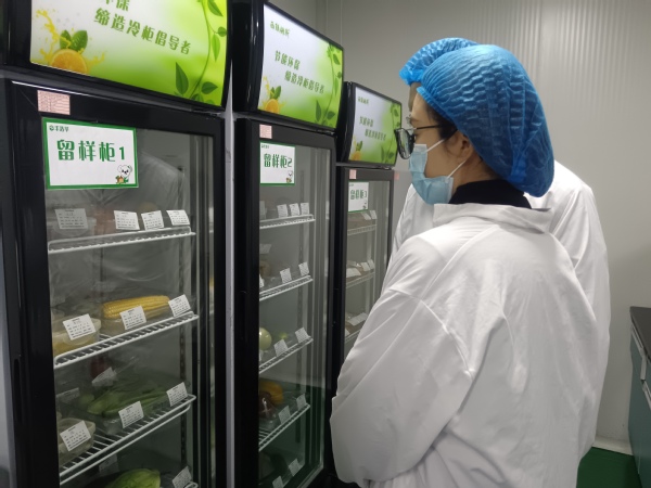 随后来到食材原料检验室,大家了解到检测人员每日需对所有食材进行农残抽样检测,检验合格并取得检测报告后,方可对菜品和水果进行分拣,同时检验的菜品需留样48小时后才能处理。