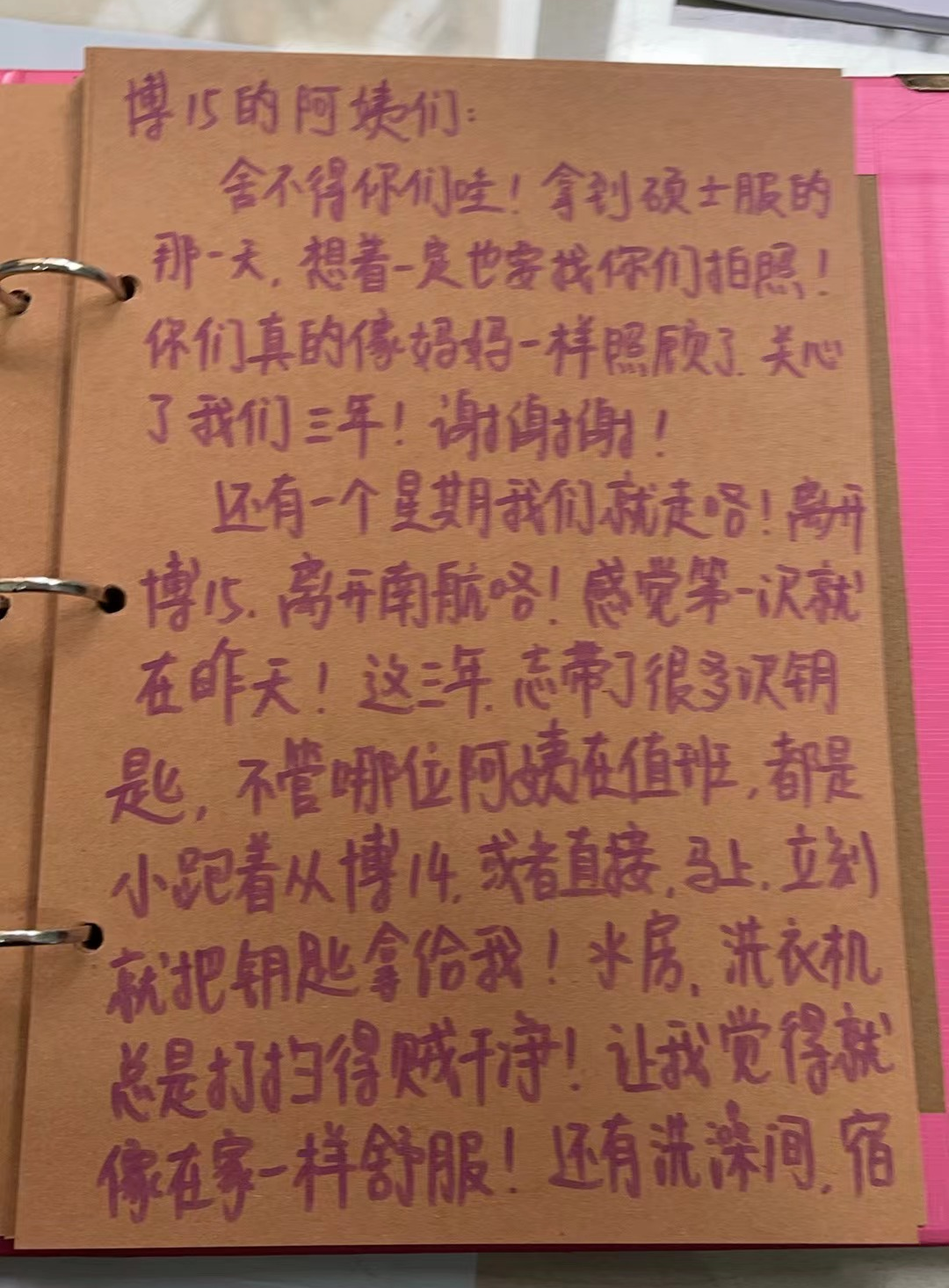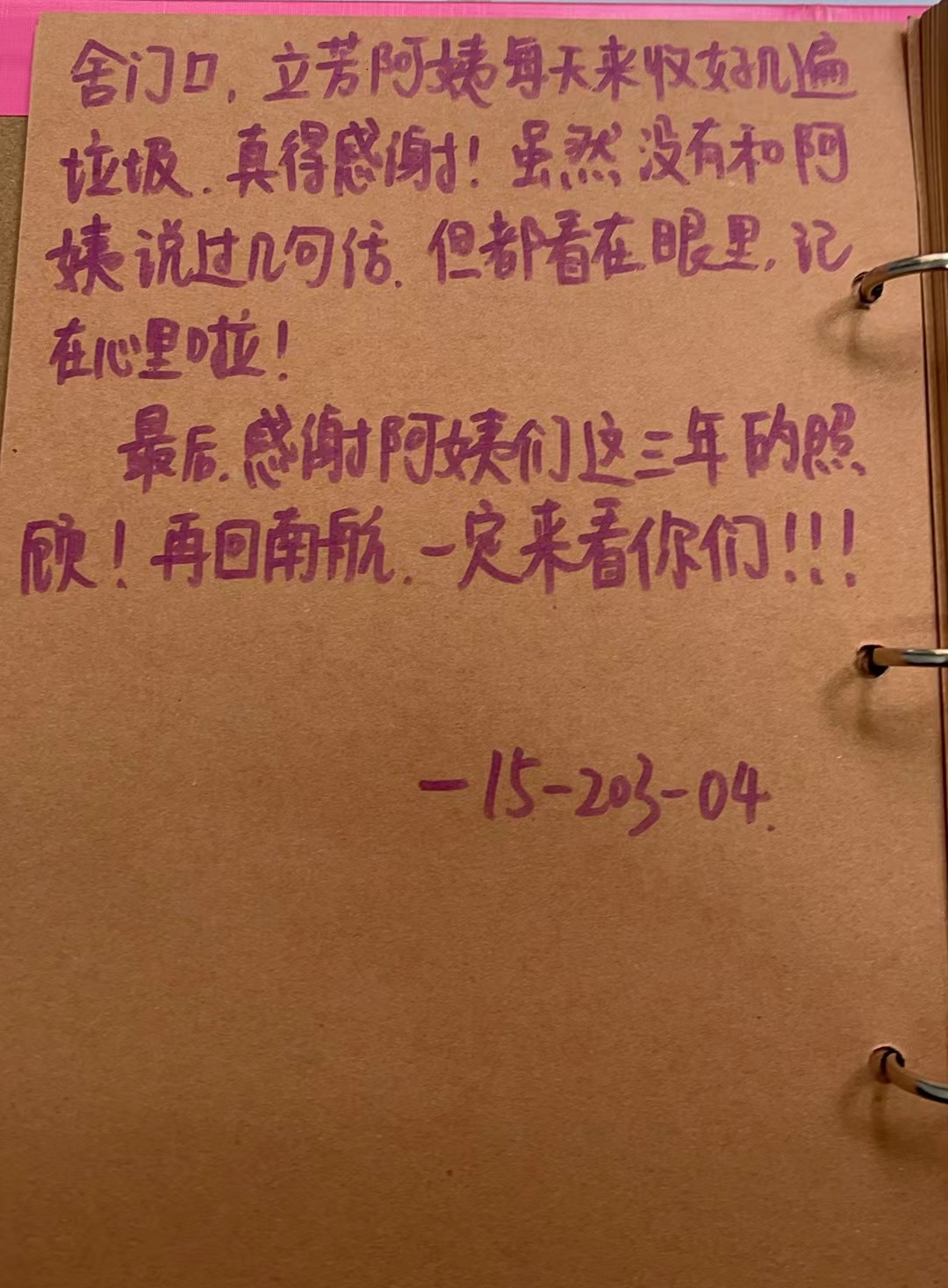 “我想对南区36、37栋的所有宿管阿姨意诚地说声谢谢,感谢您一直以来对我的关心和照顾,能够在人生最美好的年纪,遇见最善良、最和蔼、最可爱的作管阿姨们,是我们的缘分,也是我的幸运......”“感谢阿姨们这三年的照顾,再回南航,一定来看你们!”......