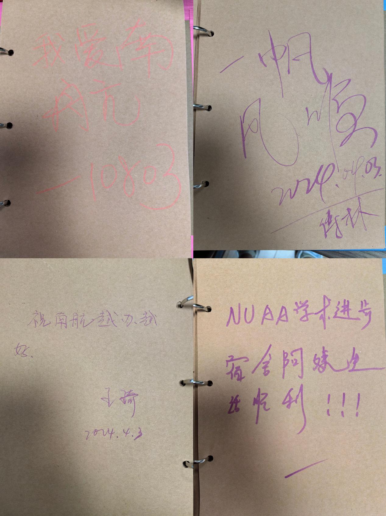 留言本上最多的,是对阿姨们的感谢和祝福。南航求学数载,日复一日,从晨光熹微到暮色四合,从夏树葱翠到岁暮天寒,公寓阿姨们以一寸方桌,守候着莘莘学子。当同学们取得成绩时,阿姨与他们一起欢呼雀跃;当同学们孤独惆怅、迷茫彷徨时,阿姨以丰富的生活阅历为他们指点迷津。一次次的微笑,一次次的叮咛,让远离家乡的学子们感受到家的温馨。收到这些留言,公寓阿姨们也纷纷表示真的非常感动,衷心祝愿即将展开人生新篇章的毕业生们,在未来的生活中,能够一直保持积极向上的心态,勇于拼搏,努力奋斗,收获成功!无论身处何方,不要忘记母校的温暖!