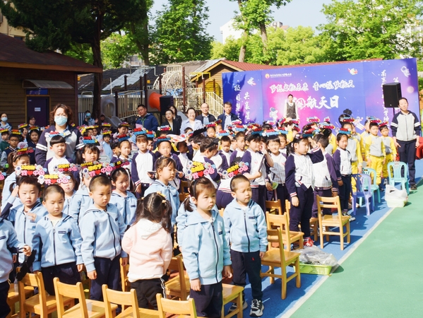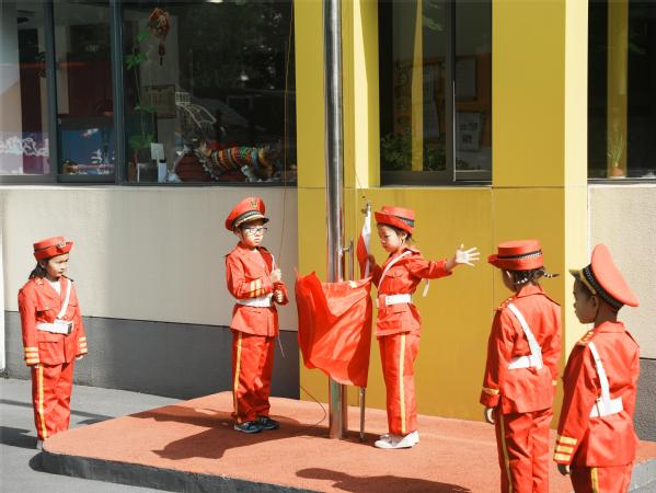 在庄严的国歌声中,全体师幼整齐地站在操场上,注视着五星红旗在朝阳下冉冉升起。
