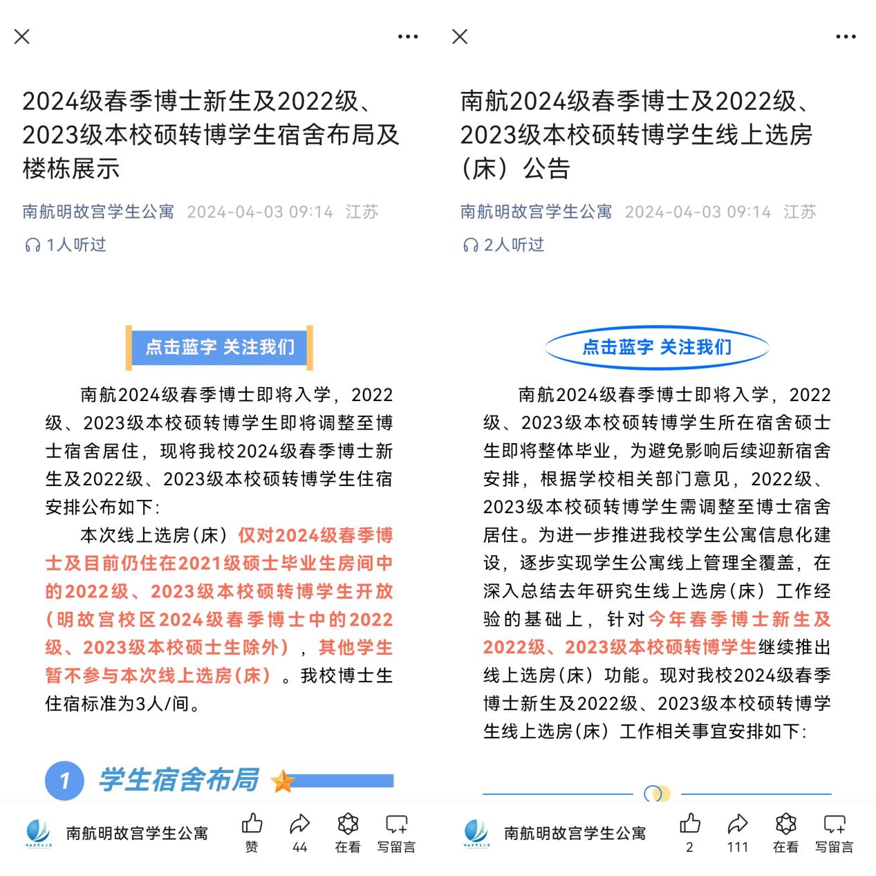 3月底,“春博新生线上选房”工作全面开启,公寓服务中心在两校区微信公众号提前发布选房相关信息,内容包含楼栋简介、选房流程、查询方式、收费标准等,信息公开透明、内容简洁明确。新生在线上选房过程中,不仅能提前看到楼栋情况,选出自己的心仪宿舍,更能为后续入校报到过程节省不少时间。