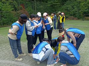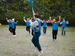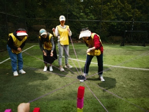 动力圈绳:在“动力圈绳”项目中,大家并肩围坐,双手握绳,一起拉紧绳圈,围成一个圆圈,顺时针上下左右摆动绳圈,通过共同绕圈计数。瞧,老师们齐心协力,一边摆动一边大声喊着“加油”,每个人的热情都被点燃,大家切实感受了同心、同向、同频对一个团队能干事、干成事的关键性。随后大家还实现了绳上走人、双脚尖离地的“奇迹”,这也是一次对个人意志和团队意识的重大考验,更是对团队配合与共同合作能力的挑战。
