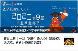 微信公众号“南航食堂”自2016年5月发布第一篇推文以来,已陪伴南航师生走过8个年头,公众号累计发布668篇推文,关注人数达34079人。微信公众号“南航食堂”向师生实时传递食堂最新咨询和动态,包括食堂菜品上新、互动文化活动、一线劳动者风采、个性化专属服务、特色产品预订等专题,旨在搭建与师生交流的平台,让师生充分享受校园丰富多彩的饮食文化生活,增强师生归属感和幸福感。