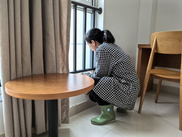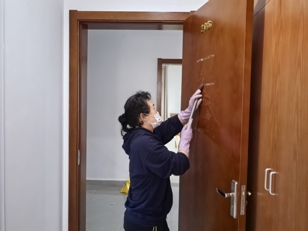 “过渡期间的住宿条件让同学们牵肠挂肚,我们理应肩负起维护学生住宿环境的责任,为他们排忧解难。”在同学们即将入住之际,公寓服务中心组织多轮保洁,70余名员工齐上阵,对外专楼的140余间房间进行了卫生大清扫。清理积尘,擦拭家具、扫拖地面、设施设备检查报修……尘土飞扬里留下了她们忙碌的身影。