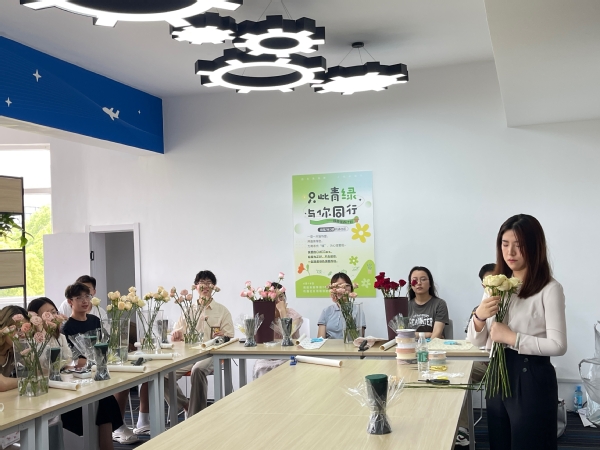 5月11日,应机电学院之邀,校园服务中心绿化技术员、国家中级花艺师、国家二级花境师史欣玥作为主讲教师与来自机电学院、经管学院和材料学院的二十多名同学分享了花艺知识,教授他们如何插制圆形花束。
