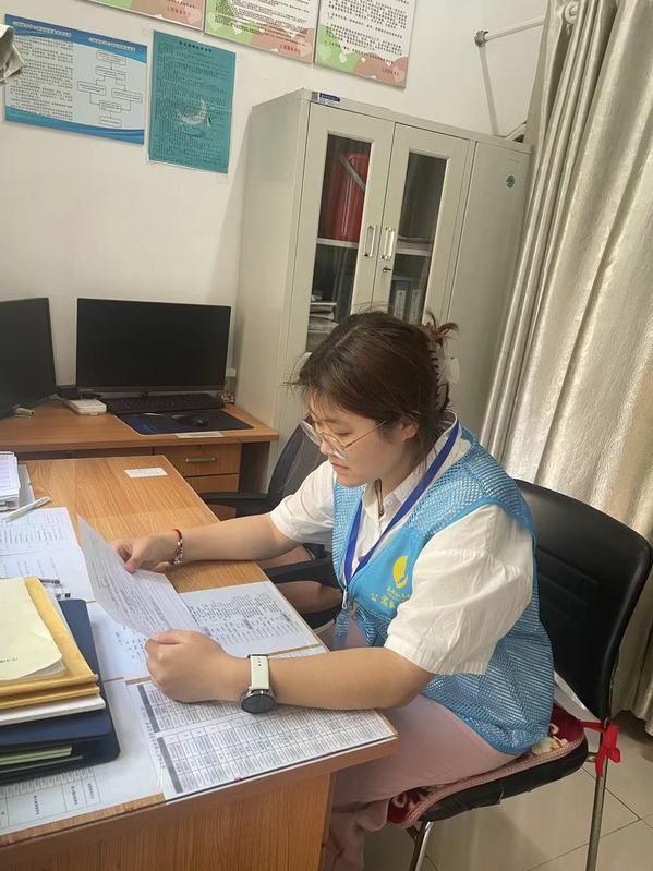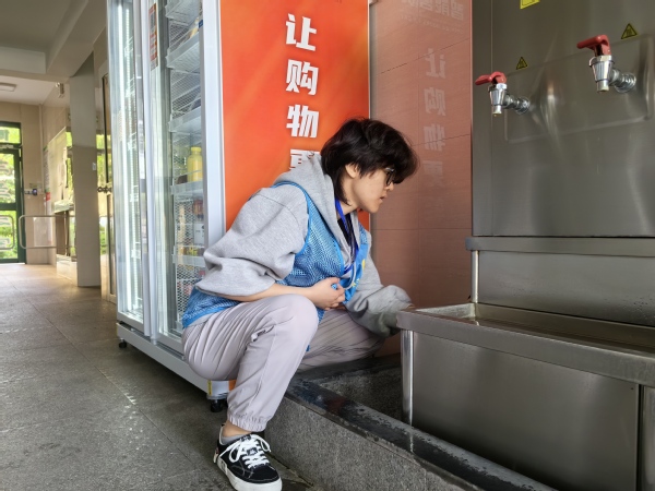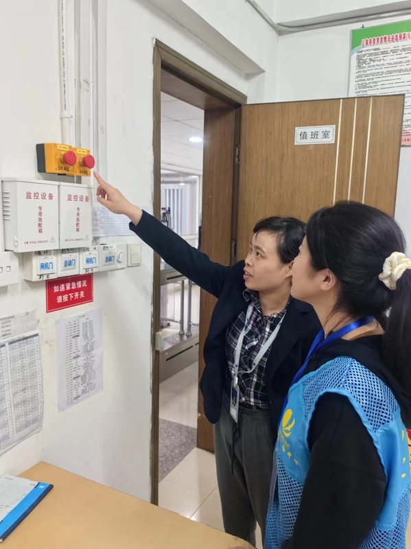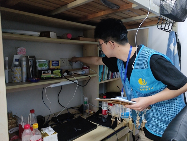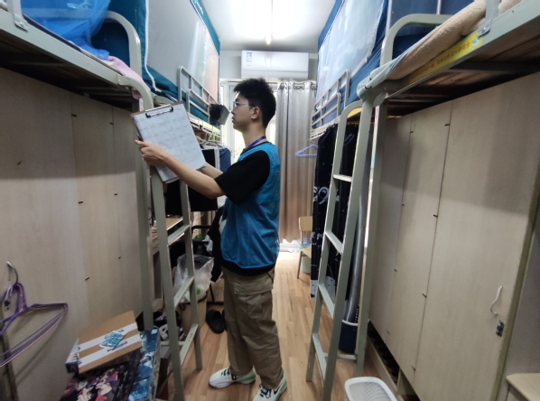 早晨八点开始,就有报名的同学身穿蓝马甲、佩戴公寓劳动体验“工作牌”准时上岗,公寓阿姨首先为同学详细讲解公寓服务的各项工作,各岗位每日的工作流程以及安全注意事项。随后,阿姨便带领同学们进行劳动体验实操。参与体验查房岗位体验的小伙伴,跟随阿姨一起带着钥匙,对一间间对宿舍进行检查巡视。“咚咚咚...”宿舍门被轻轻叩响,“你好,来查房哦。”同学们学着阿姨的样子,轻声用钥匙打开一扇扇宿舍门,仔细检查每一个床铺桌位,纠正不安全用电的行为,并在查房本上详细记录。