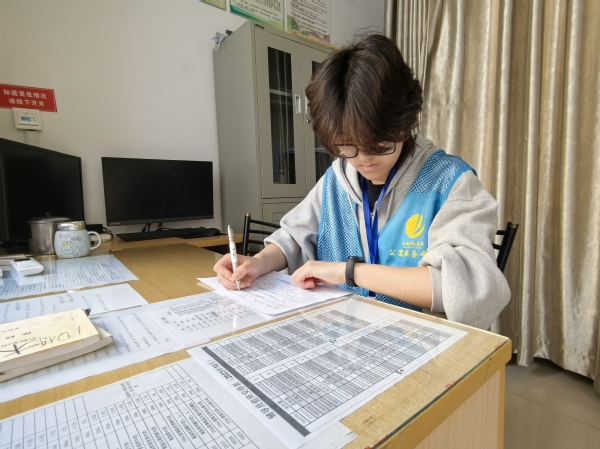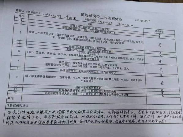 参与值班员岗位体验的小伙伴跟随阿姨学习外来人员进出、钥匙借用等台账记录工作,并和阿姨一起带上手套,拿着扫把和抹布,进行门厅卫生清扫、设施设备擦拭等工作。短短几小时的体验,同学们感受到公寓阿姨工作的不易,也体会到美好环境要靠大家共同维护。一位参与体验同学在记录本上写道:“真正参与到公寓服务,才能感受到工作的不易,非常感谢阿姨的辛勤付出。”