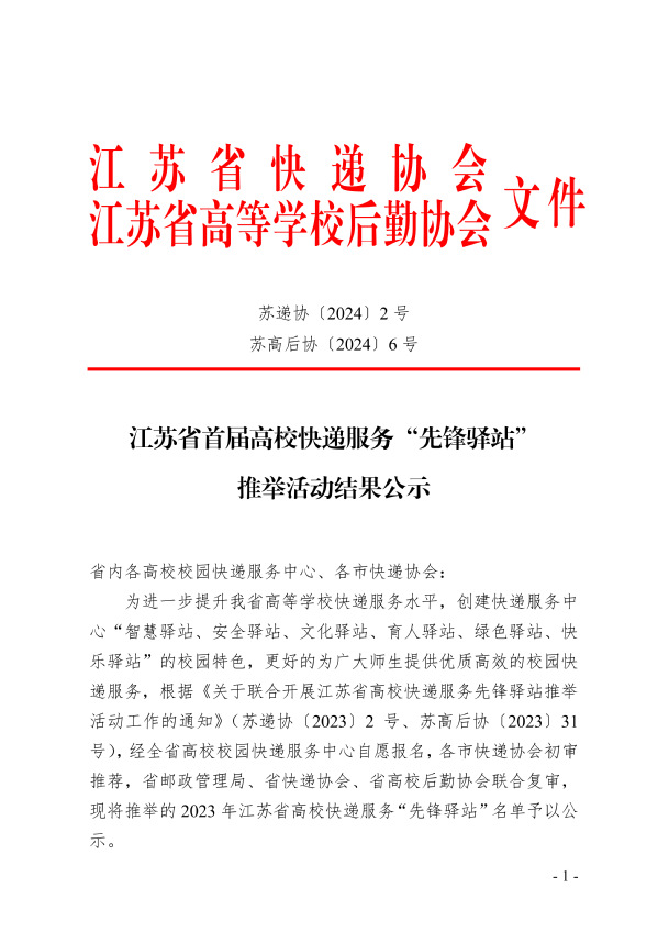 此前,江苏省快递协会、省高等学校后勤协会为进一步提升省内高校快递服务水平,创建绿色、和谐、智慧、平安校园,在全省范围内开展高校快递服务“先锋驿站”争创评选活动。活动由省内各市快递协会接受报名并组织初审、推荐,省邮政管理局、省快递协会、省高校后勤协会联合复审,经过5个月对快递驿站的智慧、安全、文化、育人、绿色、快乐等多方面进行综合评估,我校快递超市综合得分名列前茅,从全省168个高校快递服务点中脱颖而出,斩获殊荣。