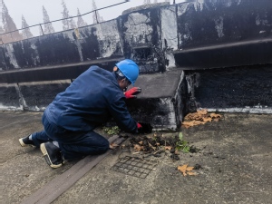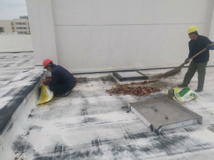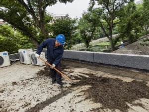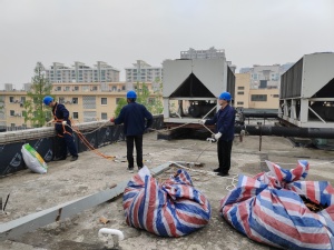 在班组长的统一安排下,大家拿着铁锨、扫帚、袋子及垃圾桶等工具小心登上楼顶,对楼顶的枯枝落叶、淤泥、砖块等杂物采取“地毯式”进行彻底清理。大家两三人一组,分工明确、齐心协力,大家不放过任何一个角落,尤其是针对楼顶垃圾死角,确保排水口干净无塞堵,同时对产生的杂物随清随运,不留积存。