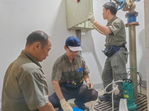 讲座结束后,水电与维修服务中心针对明故宫的A18号楼地下停车库淹水,进行了防汛抢险综合实战应急演练。中心接到险情求助电话后,中心主任周思军带队,立即调集防汛小组,按要求带齐救援设施设备,迅速赶赴救援现场。