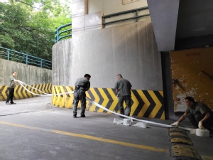 根据A18号楼实际情况,按照抢险预案分工,各抢险班组分别实施抢险活动,首先是水电工对地下车库排污泵、排污泵控制箱检查,及时恢复排污泵正常工作。修缮班组打开被淹区域井盖,设置临时警戒、疏通被淹区域管道。并在A18楼地车库坡道南北两侧出入口搭设沙袋挡水护墙,阻隔进入车库水流。同时把发电油机、深潜水泵、排水管道进行连接,构建临时抽排水系统,进行排水处理。整个疏散演练过程安全有序,现场忙而不乱。