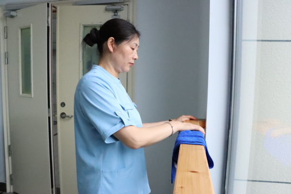 风雨中有她弯腰清理积水的身影,烈日下有她挥帚扫地的声音,任凭尘土飞扬,任凭汗水流淌,她却从不抱怨和叫苦。她用辛勤的双手,日复一日,年复一年,无论春夏秋冬,坚守在普通保洁的岗位上,用心守护着天目湖校区的整洁与美丽。师生也曾多次表扬她,“这位阿姨太细心了,任何一个角落都被她打扫得干干净净,每天走在校园里心情都很好。”作为一名普通的基层员工,她身上的这份执着、这种对工作坚守的精神,感染着身边的每一个人。
