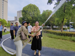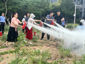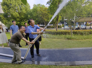 实操演练环节分灭火器演练和高压水枪演练两部分。在灭火器实操演练中,袁琪老师向大家讲解了易学易记的灭火器操作口诀“提、拔、握、压”,参培人员依次上场,将模拟火情迅速扑灭。在高压水枪演练中,参培人员实操了水带水枪组装和喷水。