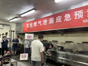 在应急演练环节,模拟了食堂燃气泄漏情景。触发警报后,食堂员工迅速反应,按照既定的应急程序有序疏散、关闭燃气阀门、扑灭火情,同时,及时联系相关部门报修。演练现场还通过展示提示牌,帮助参培人员加深对应急处置预案关键步骤的记忆,确保员工熟悉并正确应对燃气泄漏突发情况。
