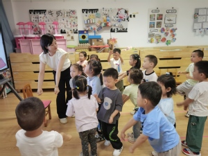 小班律动“小鼹鼠挖呀挖”:音乐活动中,周珊珊老师和孩子们一起变身“小鼹鼠”,在寻找食物的游戏情境中,通过看、走、闻、挖等动作,感知和体验音乐的韵律和有趣。