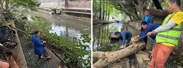 在暴风雨的侵袭下,将军路校区慧园三栋东侧运动场、民航学院南侧等处出现树木断裂,现场残枝落叶散落一地,凌乱不堪;明故宫校区校医院南侧玉带河边有1棵大树倒伏,从根部折断横在河面上,101旋翼实验室门前的1棵松柏被连根拔起,倒伏在路面上。面对这些庞大沉重的残树,抢险人员分工明确,紧密协作,凭借丰富的经验和专业的技能,灵活运用工具对树木进行切割、捆绑和搬运,并对占道的树枝进行清理,快速恢复道路交通。在经过紧张有序的抢险救灾工作后,校园内的险情得到了有效控制,环境也迅速恢复到往日的干净、整洁。