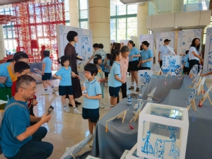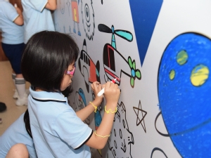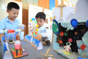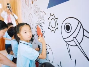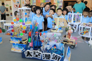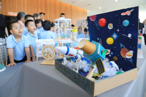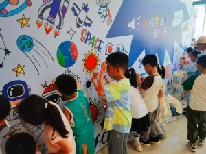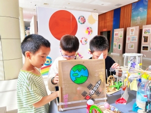作为科技特色园,毕业展还处处融合了航空航天特色,孩子们有的拿起画笔,以笔尖和画布为载体描绘火箭、飞船、空间站等航空航天器,有的用线条和航空航天器印章进行纸杯装饰;展区内还展示了科技感满满的航空航天科技小制作,孩子们发挥奇思妙想将废旧品加工创作,变成了一件件能动能亮的科技作品。无论是涂鸦画作还是科技作品,都表达了孩子们对浩瀚太空的无限遐想和美好的憧憬。