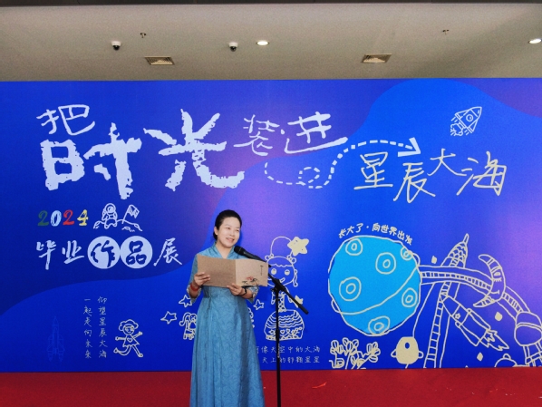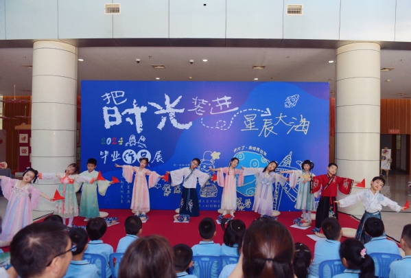 各位领导嘉宾共同为“把时光装进星辰大海”毕业生艺术展剪彩,剪彩的图案是由孩子们亲手绘制而成的,别有一番童趣,随着嘉宾们的剪彩,本次毕业生艺术展正式开幕。