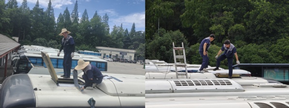 为给师生提供舒适的乘车环境,修理工们不惧高温,咬牙坚持。5辆大客车的车顶修复全在烈日的炙烤下进行,他们的皮肤被晒得黝黑,汗水湿透衣衫,像刚从水里捞出来一样,但手中的工具仍在飞速转动,螺丝刀精准地拧紧每一颗螺丝。