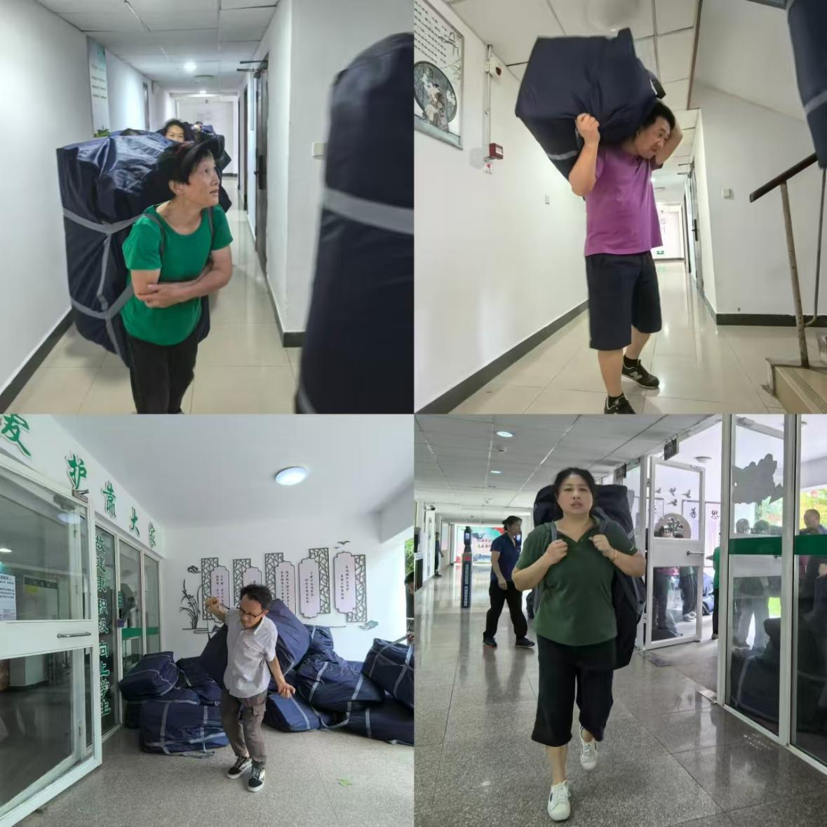 8月底,南京依旧持续高温,公寓员工将学生卧具搬上一层层楼,布放入学生寝室内床位上,一趟趟下来所有人的衣服都早已被汗水浸湿,浑身酸痛。但看到一套套整齐摆放的卧具包,想象到新生到来时拆开时的欣喜,所有劳乏已不在心上。