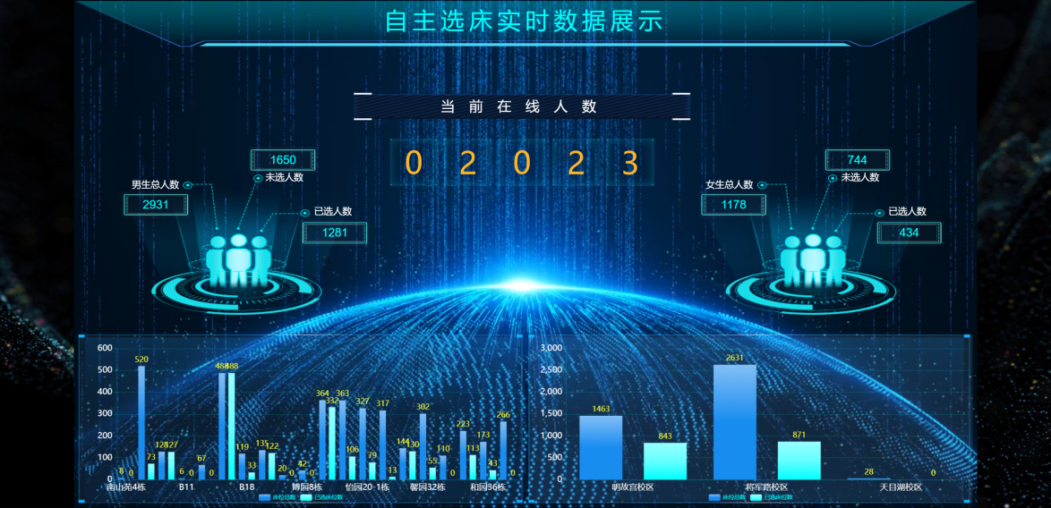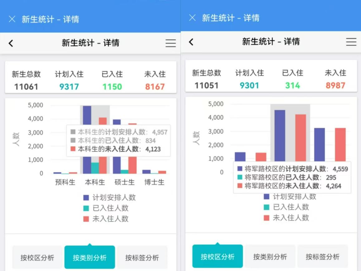 迎新准备期间,中心办公室与学工部门密切联系和配合,提供床位资源信息,拟定南京两校区秋季学期新生住宿分配方案;与信息化处沟通协调完成研究生线上选床和学生扫码办理入住流程的准备。提前做好新生宿舍门禁系统的授权设置工作,节省新生报道入住时间。迎新期间实时掌握入住人数、实时报到率、当日各时段报到情况等。