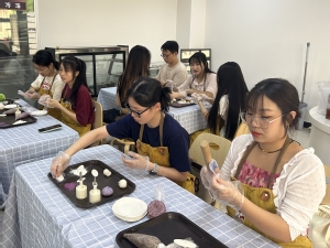 活动现场邀请了食堂专业的面点师傅进行教学和指导。教学过程中,师傅详细讲解了月饼面皮的原材料和制作流程,用专业手法演示包馅料的过程,同时示范了使用按压模具的技巧和细节,同学们认真倾听,受益良多。