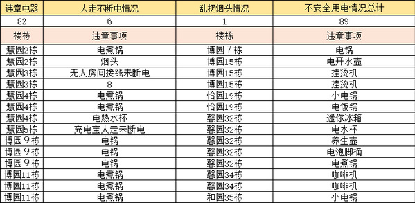 七天假期,两轮安全突击查房,共计查到消防隐患和不安全用电情况89例,其中违章电器82件,人走不断电情况6起,乱扔烟头情况1起,汇总后上报学生处、研究生院和保卫处消防科。