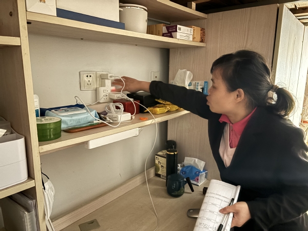 早晨7:00,管理员们已经来到岗位上做好准备。她们轻手轻脚地开启一间间寝室进行查房,重点对公寓的消防安全、用电安全进行深入排查,着重检查学生是否存在私拉乱接电线、使用违章电器等不安全用电行为,提醒学生要增强安全用电意识,杜绝安全隐患。