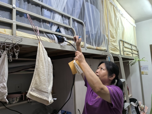 一轮全面查房工作需要8个多小时,平均每一位管理员要开启300余间寝室门,查看1200余个床位。查到的消防隐患和不安全用电情况实时通报在公寓微信工作群,个别无法确认的新型电器,管理员也会实时在线询问共同探讨确认。查到违章用电时,管理员阿姨们耐心地向学生们进行安全宣传和沟通讲解,叮嘱他们安全用电,保障自己和舍友的安全。
