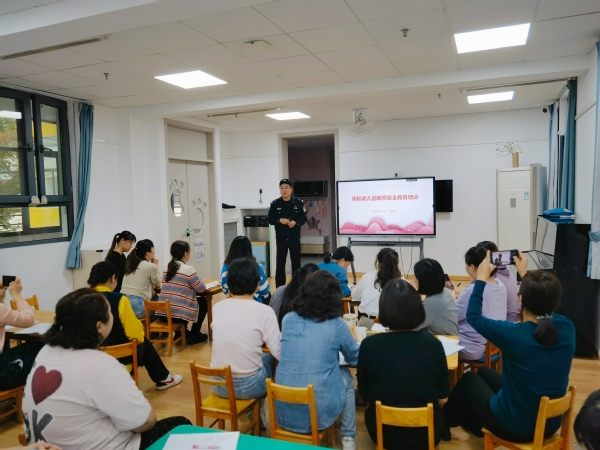 为进一步提升教职工的安全意识,切实做到人人懂安全,人人抓安全,把安全工作落实到自己的岗位职责中,10月16日中午,南航幼儿园邀请安全法治辅导员、瑞金路派出所民警江雨甜、季建华来园对全体教职工开展安全教育培训。