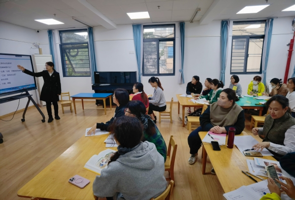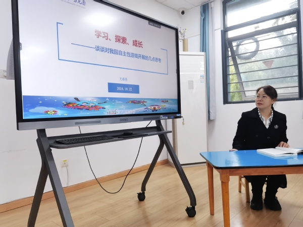 幼教中心副主任尤春香进行了分享,她围绕我园游戏开展的实际情况,结合阅读体会、外出学习收获等,从游戏精神解读、游戏环境创设、游戏材料提供、游戏区域设置、师幼和幼幼互动及优秀案例展示等方面,分享交流了对我园“三航”主题自主性游戏开展的思考和建议,鼓励教师们相互学习、不断探索,共同为孩子们打造自由、自主、创造、愉悦的游戏乐园。