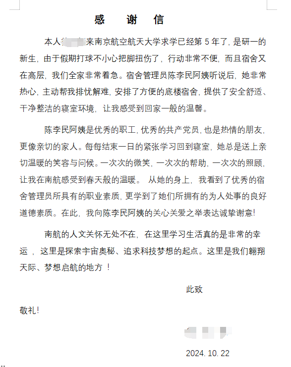 “从她的身上,我看到了优秀的宿舍管理员所具有的职业素质,更学到了她们所拥有的为人处事的良好道德素质......”近日,将军路校区公寓管理员阿姨陈李民收到了一封感谢信。