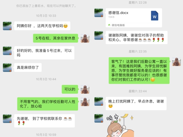 徐同学的父母因工作原因不能来学校陪护他,了解到陈李民阿姨对孩子的关怀和照顾后,心里的感动无法言说。在抽空来学校看望孩子的同时,特地当面向陈李民致谢。徐同学也写了一封感谢信表达感激。看着信中一字一句的真情流露,陈李民也不禁热泪盈眶,她和孩子的母亲说:“我是一名党员,也是一名公寓阿姨,照顾学生是我应该做的,你们安心工作,放心把孩子交给我们。”