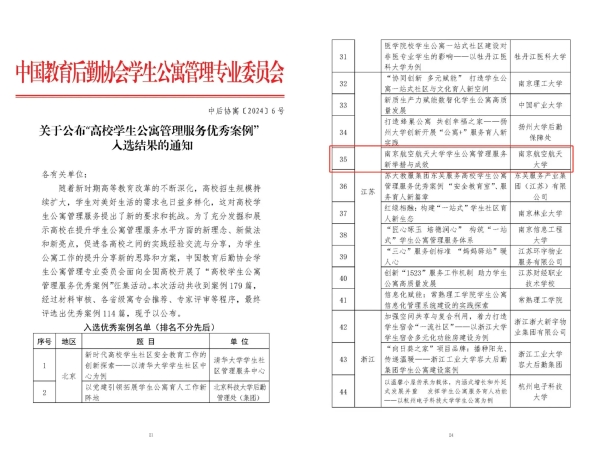 近日,中国教育后勤协会学生公寓管理专业委员会面向全国高校征集“高校学生公寓管理服务优秀案例”,共有来自全国高校179个案例参与评选。经过材料报送、省级寓专会推荐、专家评审等程序,我校《南京航空航天大学学生公寓管理服务新举措与成效》案例成功入选优秀案例。