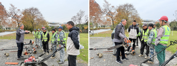 保洁、园林机械操作技能培训由中心主任助理、园林绿化高级技师魏声兵主讲,中心绿化工及相关工作人员参与了本次培训。魏声兵紧密结合中心标准化要求,针对园林绿化植物的修剪原则、机械操作规程及安全技术规范,为参训人员提供了清晰的指导。