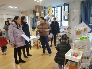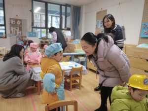 在常态化的游戏现场,陈育勤在园领导的陪同下,一起实地查看了各班级室内外游戏场地设置、游戏材料投放,观摩了游戏开展情况、幼儿游戏状态以及教师游戏指导等情况。