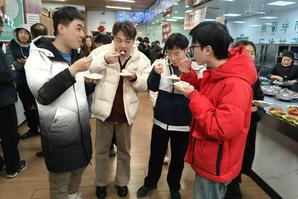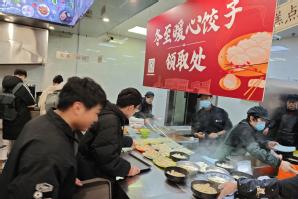 随着活动的推进,冬至暖心水饺的登场更是将现场氛围推向了高潮。一份份热气腾腾的饺子,如同冬日里的一抹暖阳,温暖着每一位在场学生的心田。这些饺子不仅承载着冬至的传统习俗,更寄托了饮食服务中心的深情厚意。同学们围坐在一起,品尝着美味的饺子,整个现场洋溢着浓浓的温情与欢乐。