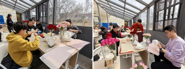 在整理花束环节,先用螺旋手法将十几枝花朵巧妙整合,塑造饱满的半球形,大家时而远观,时而近瞧,从各个角度仔细观察,耐心地调整花束的疏密,力求达到完美的视觉效果。待花束整理完毕,再剪掉多余的枝干,使其高度协调统一、层次清晰分明。接着便是制作纸质花瓣环节。大家拿起包装纸,着手折叠操作。然而这并非易事,许多人都遇到了困难,折出的花瓣形状不尽人意。但面对挑战,大家没有丝毫退缩,而是彼此帮助,携手共进。那些已经熟练掌握了技巧的同志,热情地向身边伙伴传授经验,还有些人聚在一起,研究探讨更优的折叠方法。在相互协作与交流中,一个个精美的纸质花瓣逐渐诞生。最后,再将整理好的花束与制作好的纸质花瓣巧妙搭配。不一会儿,一束束蕴含着创作者独特构思的花艺作品便呈现在眼前。
